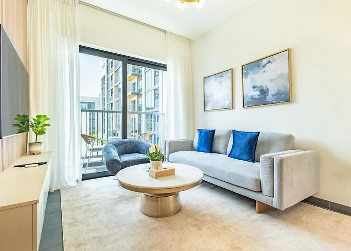 Luxury 1Br, The Crest, Sobha Hartland Apartment offers convenient self-catering facilities, including an equipped kitchen with an electric kettle, a refrigerator, and kitchenware. Luxury 1Br, The Crest, Sobha Hartland Apartment is around a 10-minute ride from Business Bay train station. Guests will enjoy having a private pool on site.